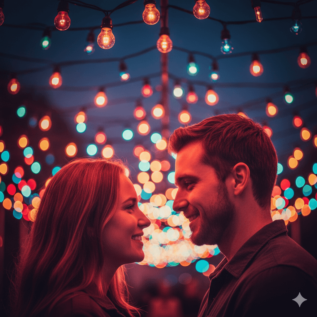A couple under colorful festival lights, warm light on faces, soft blur, intimate smile, cinematic portrait style.