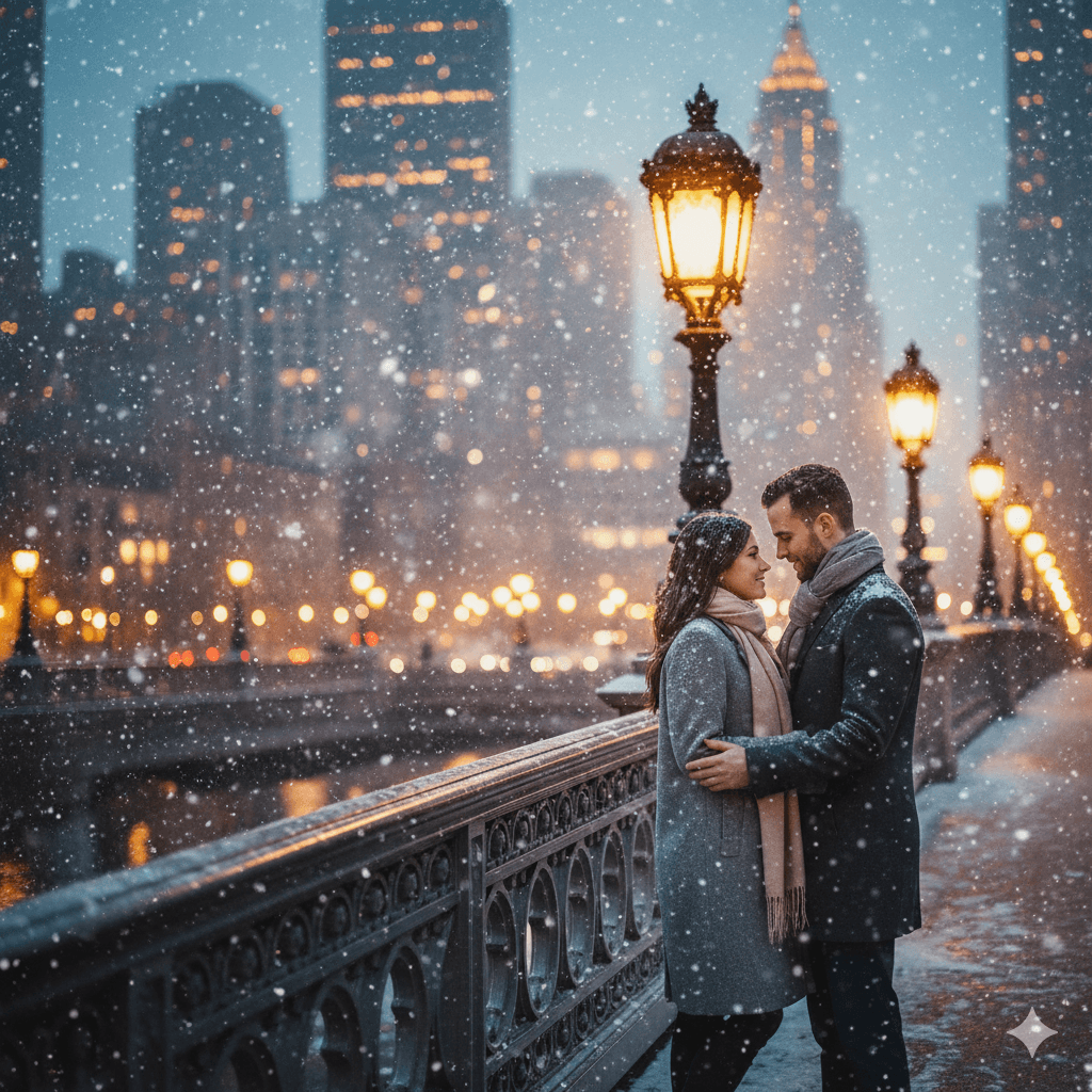 A couple in chic winter coats standing on a bridge in soft snowfall, glowing city lights behind them, serene cinematic tone.