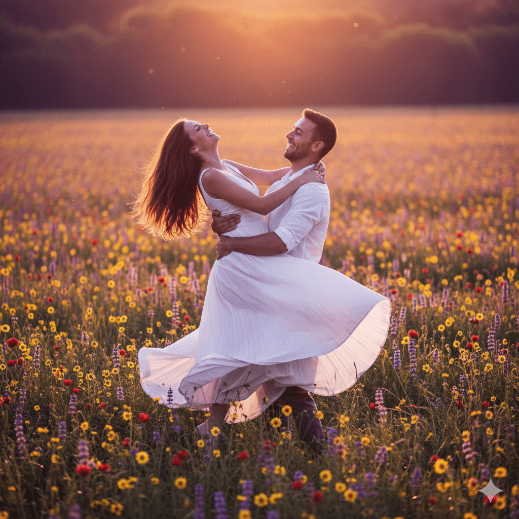 A man lifting a woman in a meadow filled with wildflowers during sunset, flowing dress motion, dreamy warm aesthetic.