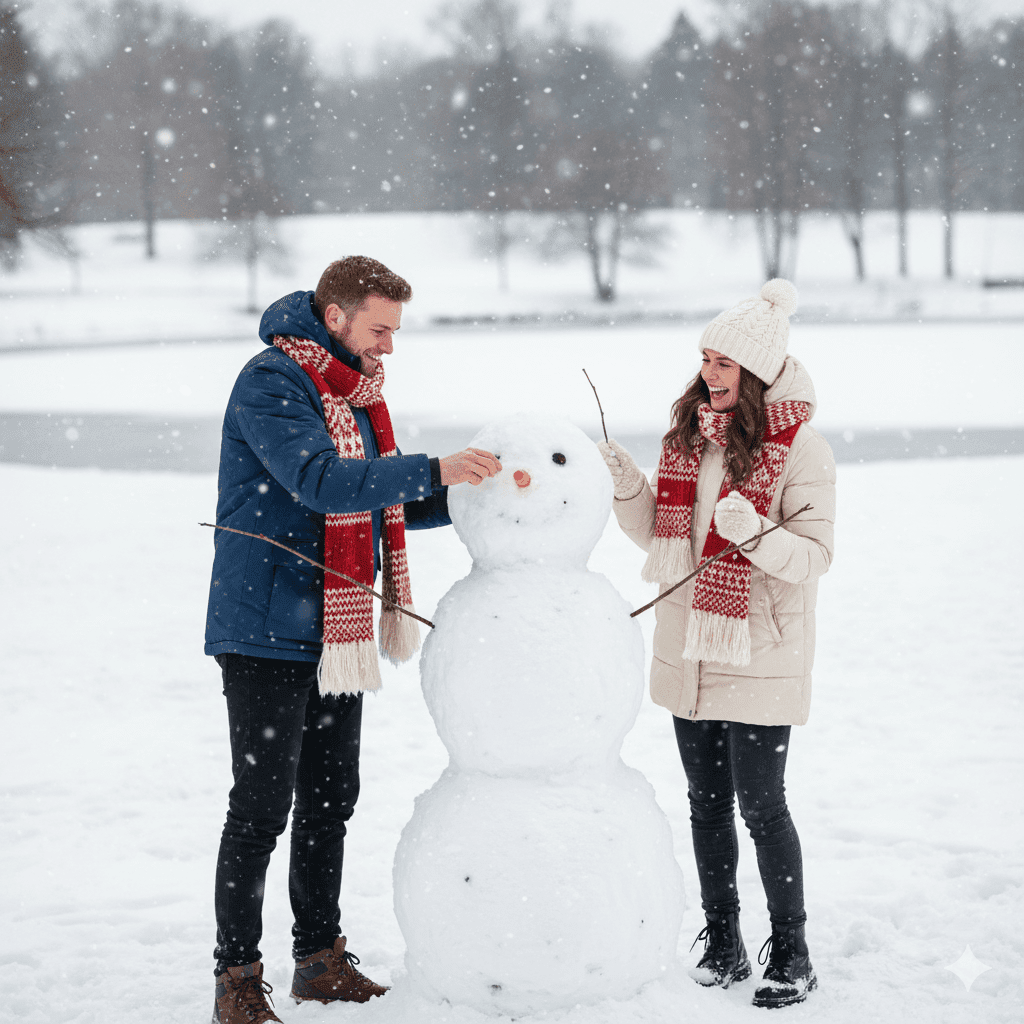 A couple wearing matching scarves, building a snowman in a snowy park, playful and heartwarming, soft falling snow, 4K clarity.