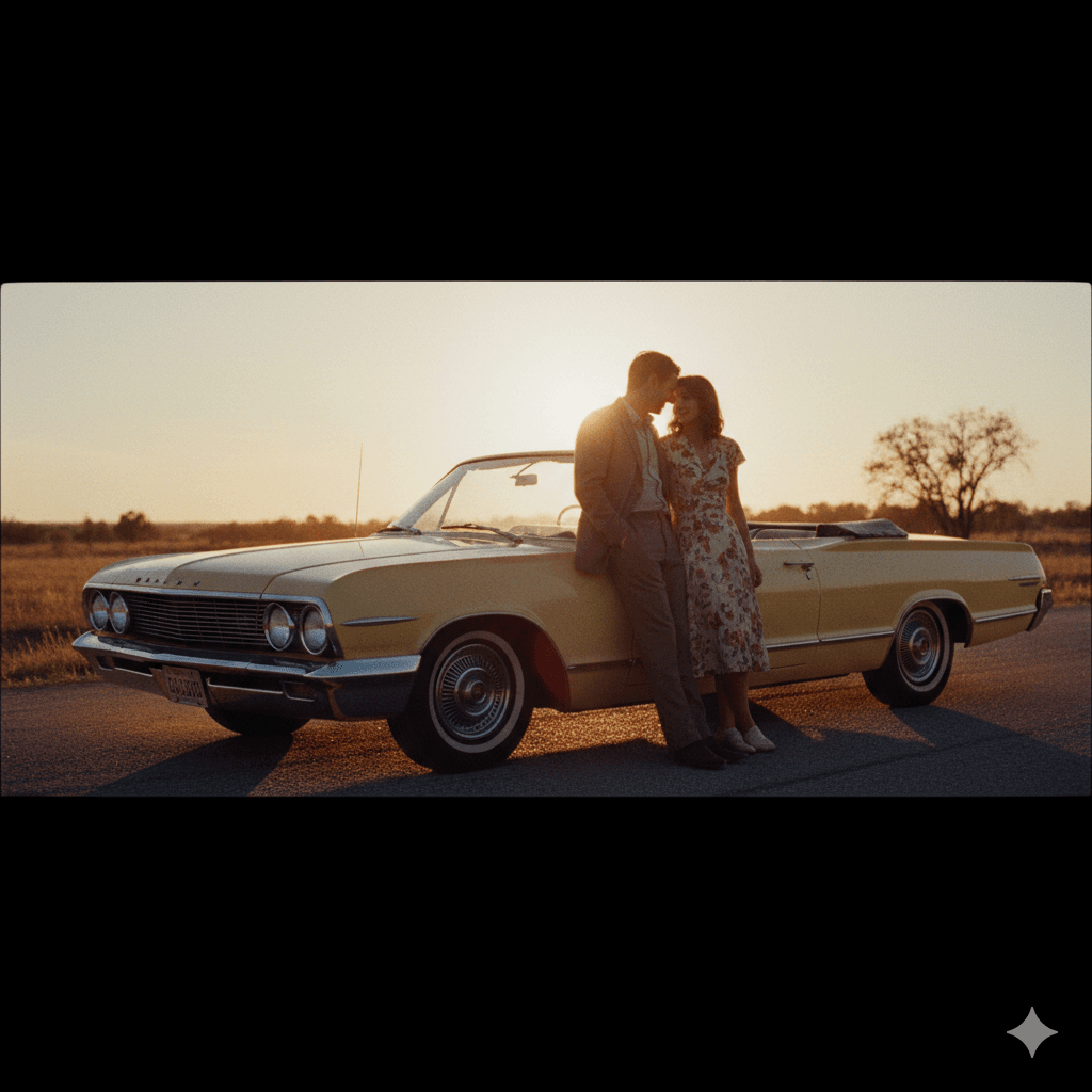 A couple leaning against a classic 1960s car, golden hour backlight, deep grain texture, nostalgic cinematic vibes.