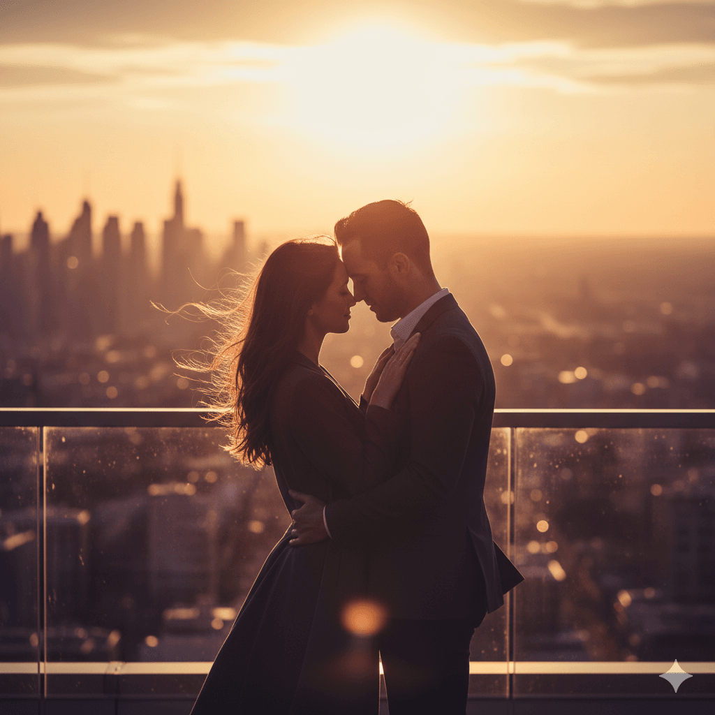 A couple hugging on a modern rooftop, warm golden hour glow, city skyline bokeh, soft wind, cinematic mood.