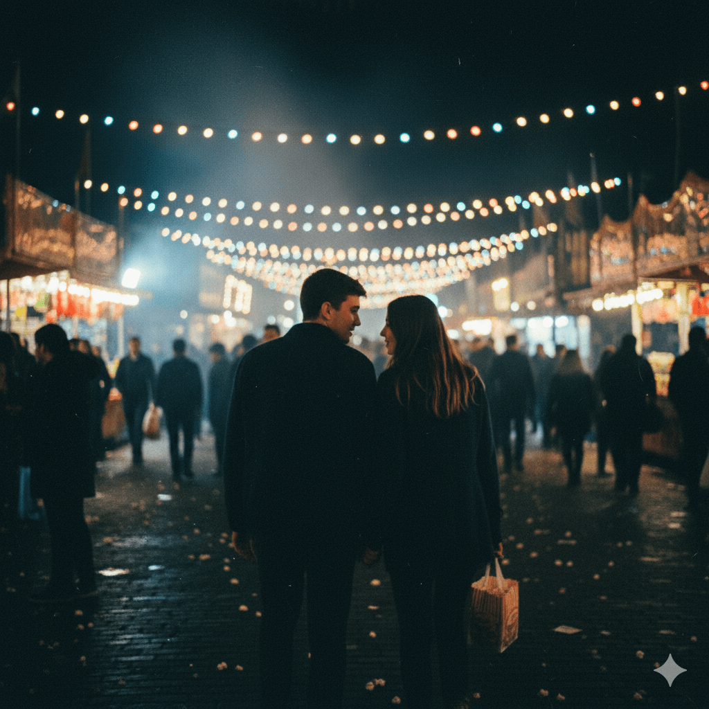 A couple walking through a night fair with fairy lights and blurred crowds, documentary-style motion, gritty film texture.