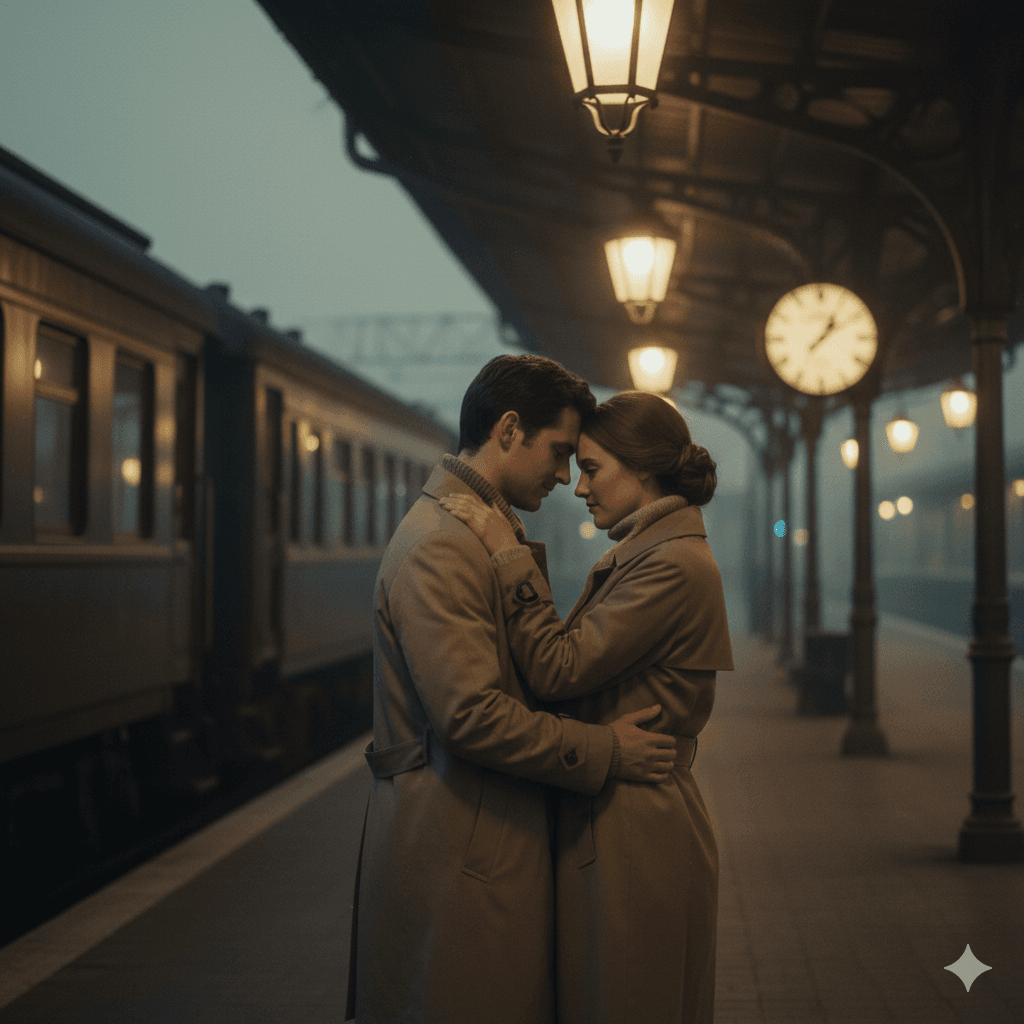 A couple standing close at a vintage train station, soft film saturation, nostalgic warm tones, emotional pose, subtle grain.