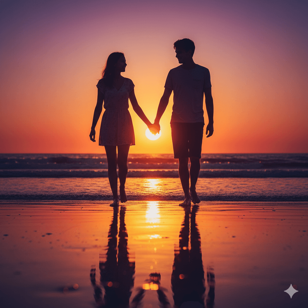 A couple holding hands, walking along a beach during a vibrant orange-purple sunset, full-body silhouettes, strong rim light, cinematic wide-angle, ultra-HD.
