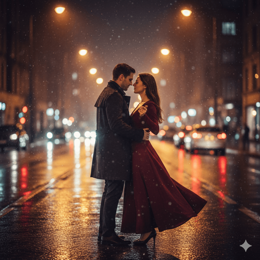 A couple dancing under glowing streetlights on a rainy night, reflections on wet road, cinematic emotional vibe, soft bokeh lights.
