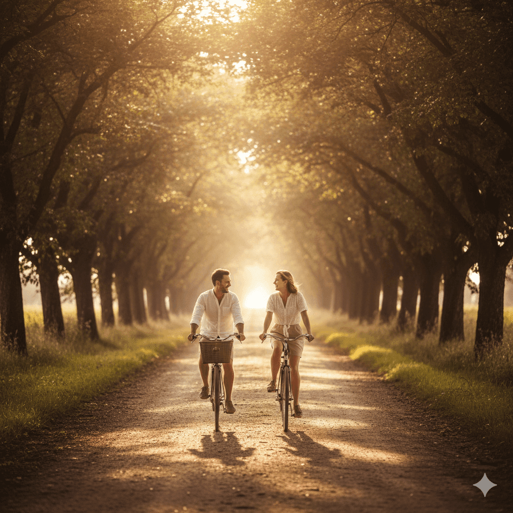 A couple riding vintage bicycles on a tree-lined country lane, golden sunlight filtering through leaves, dynamic joyful moment, rustic romantic aesthetic.
