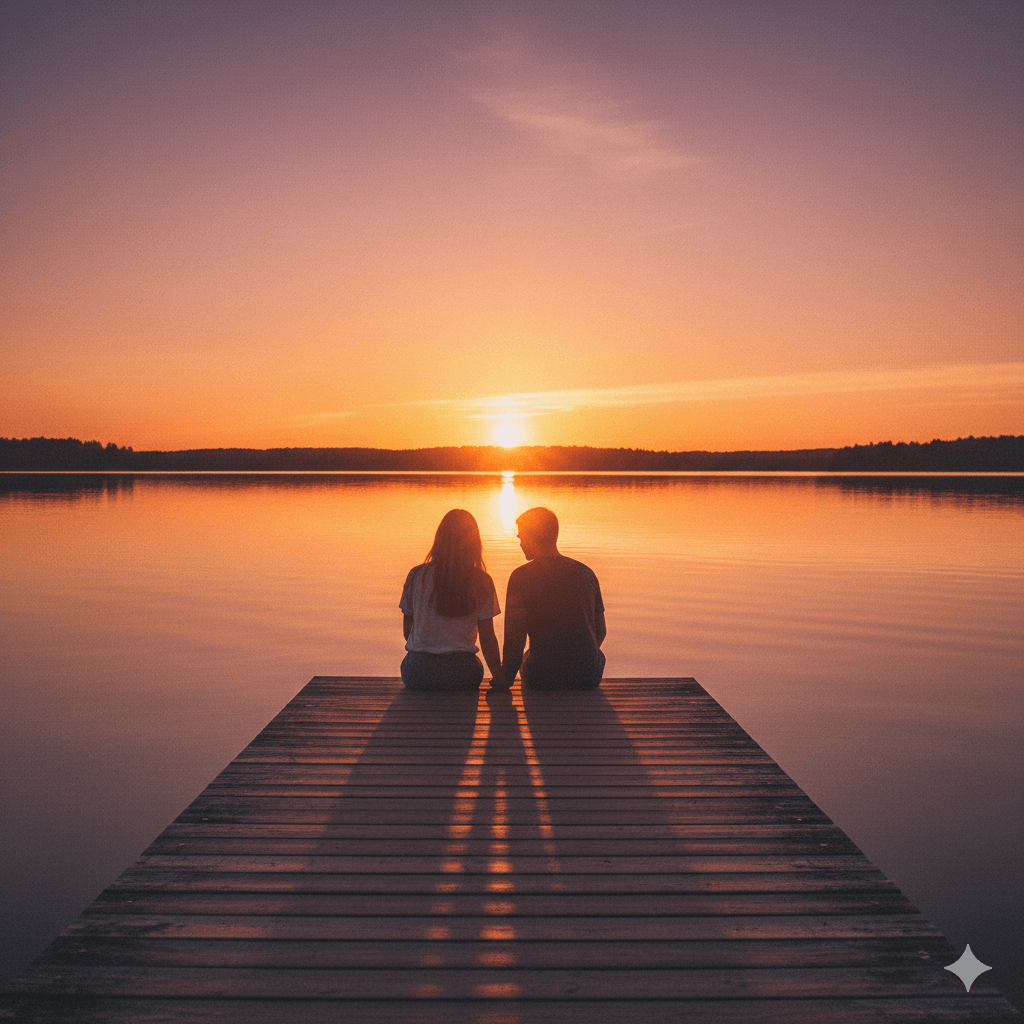A couple sitting on a wooden dock by a calm lake at sunset, warm reflections, peaceful and intimate mood.