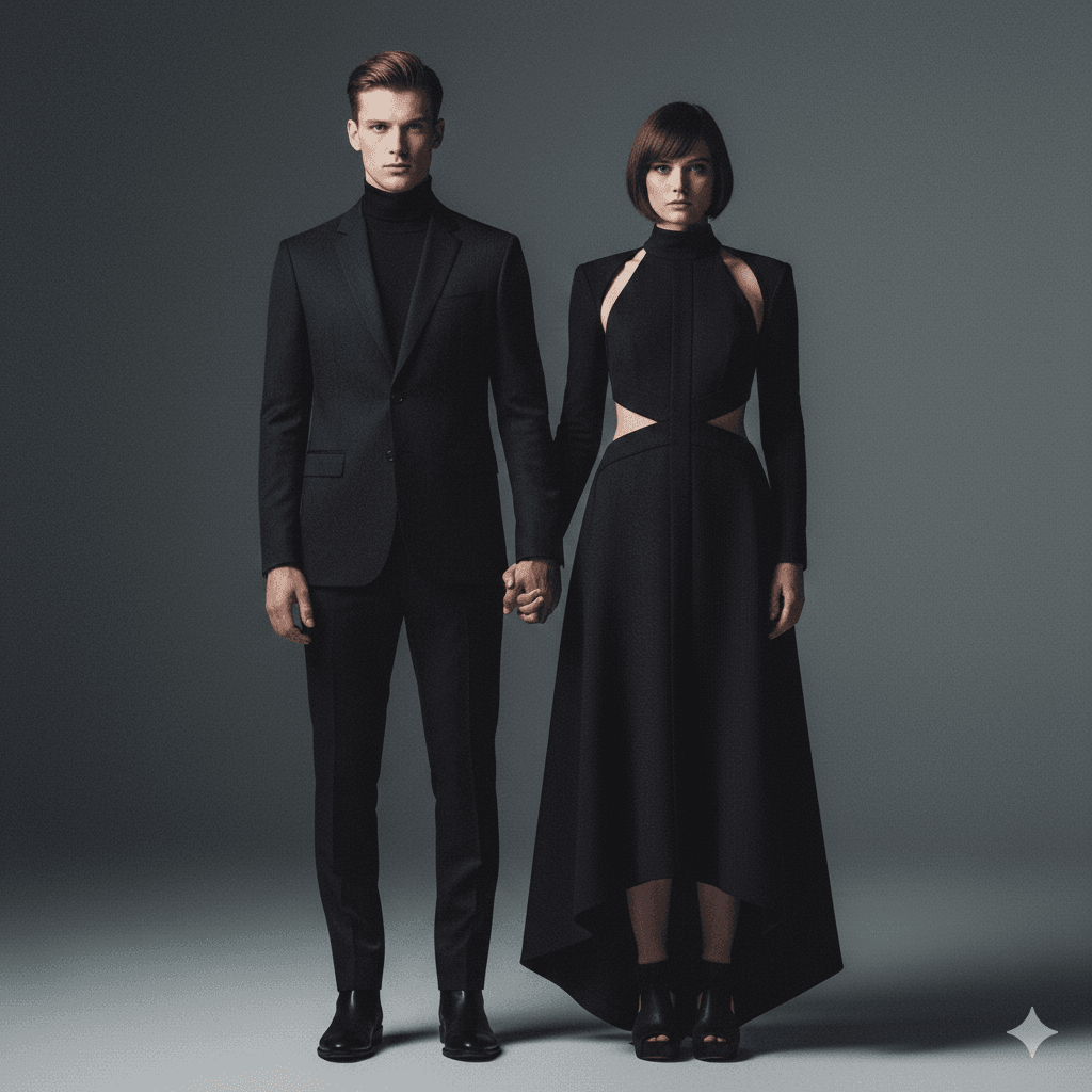 Couple wearing all-black outfits in a soft-light studio, high-resolution details, minimalistic 2026 editorial style.