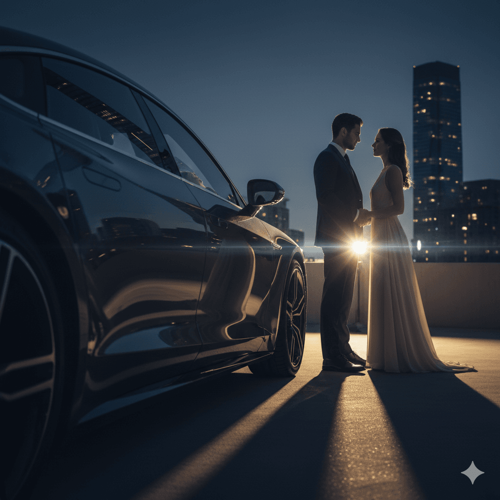 Couple standing beside a luxury car with reflections, cinematic low-angle lighting, modern premium color tone.