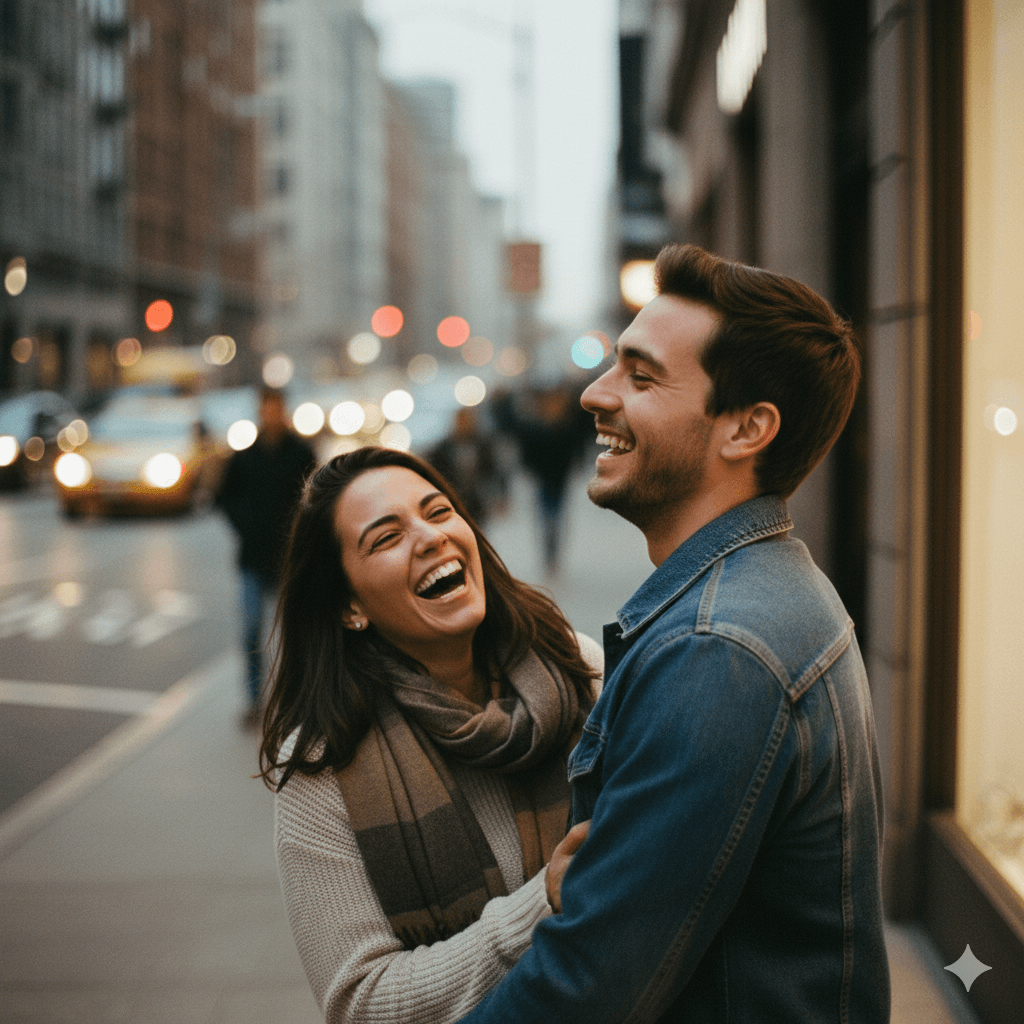 Couple laughing at a street corner, soft background blur, handheld documentary feel.