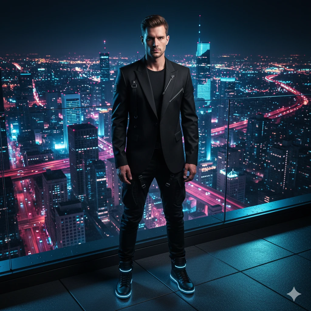 Full-body male model in sleek techwear-inspired blazer, slim pants, standing on modern skyscraper rooftop, neon city background, cinematic ambient lighting, ultra-detailed 8K portrait.