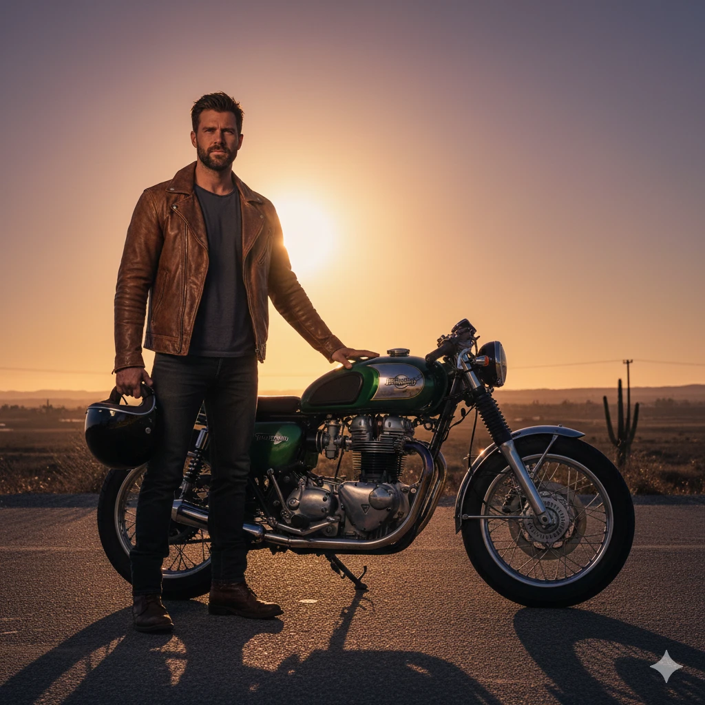 Full-body portrait of man in leather jacket, vintage helmet, boots, standing beside classic motorbike, sunset in background, cinematic shadows, shallow depth of field, ultra-realistic 8K fashion portrait.