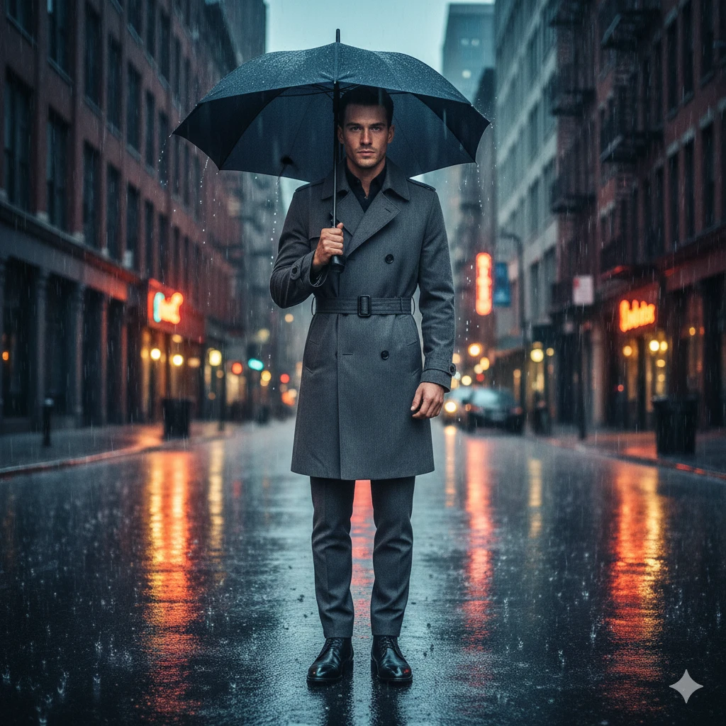 Full-body portrait of man holding umbrella in heavy drizzle, wearing charcoal trench coat, tailored trousers, leather boots, reflections on wet urban street, cinematic moody lighting, ultra-realistic 4K fashion portrait.