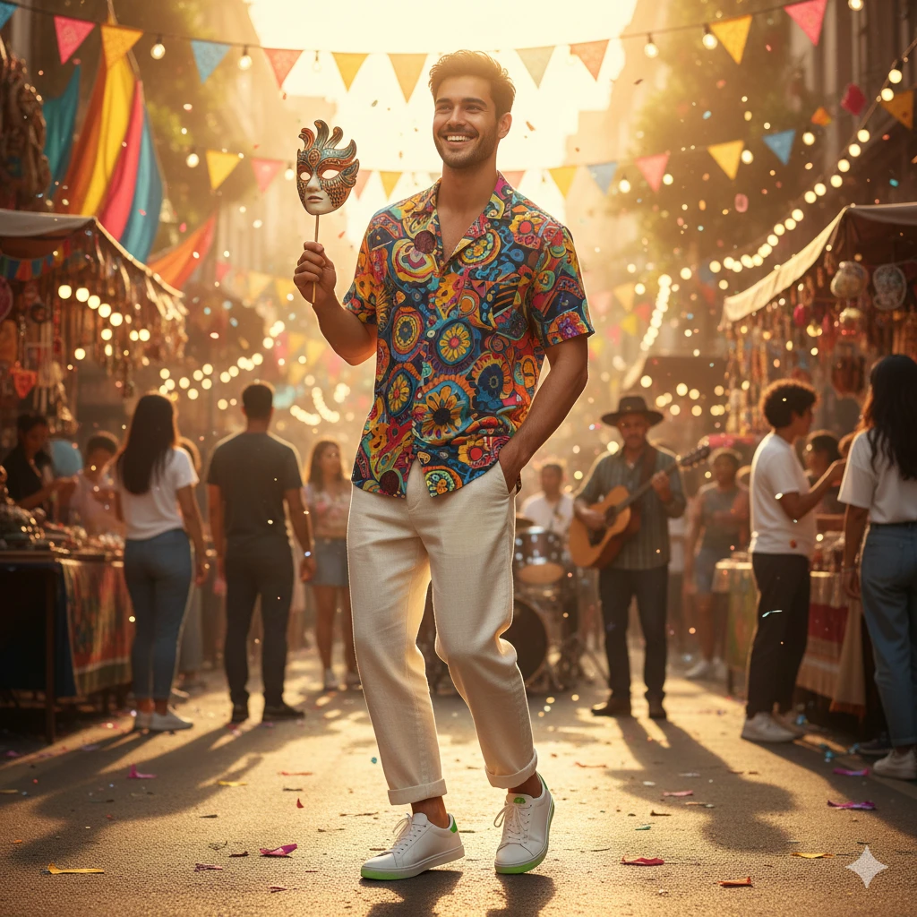 Full-body young man in colorful printed shirt, linen pants, casual sneakers, standing on vibrant street festival, golden hour lighting, dynamic casual pose, ultra-realistic 8K fashion portrait.
