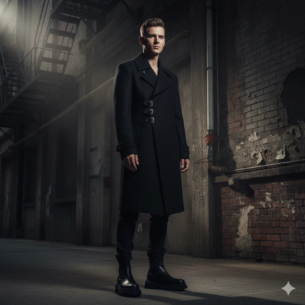 Full-body portrait of man in black asymmetric coat, designer boots, standing in industrial urban setting, dramatic side-lighting, cinematic editorial high-fashion 8K portrait.
