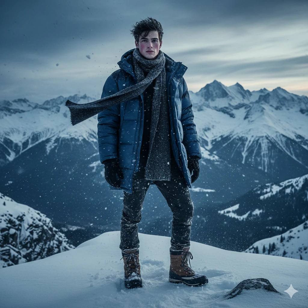 Full-body young man in puffer jacket, snow boots, scarf, standing on snowy mountain edge, wind tousled hair, cinematic cold ambient light, ultra-realistic 8K adventure fashion portrait.