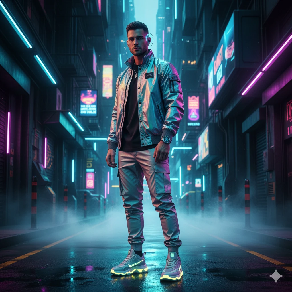 Full-body man in holographic streetwear jacket, reflective cargo pants, standing in neon-lit futuristic alley, subtle cybernetic accessories, volumetric fog, cinematic lighting, hyper-detailed 8K fashion portrait.
