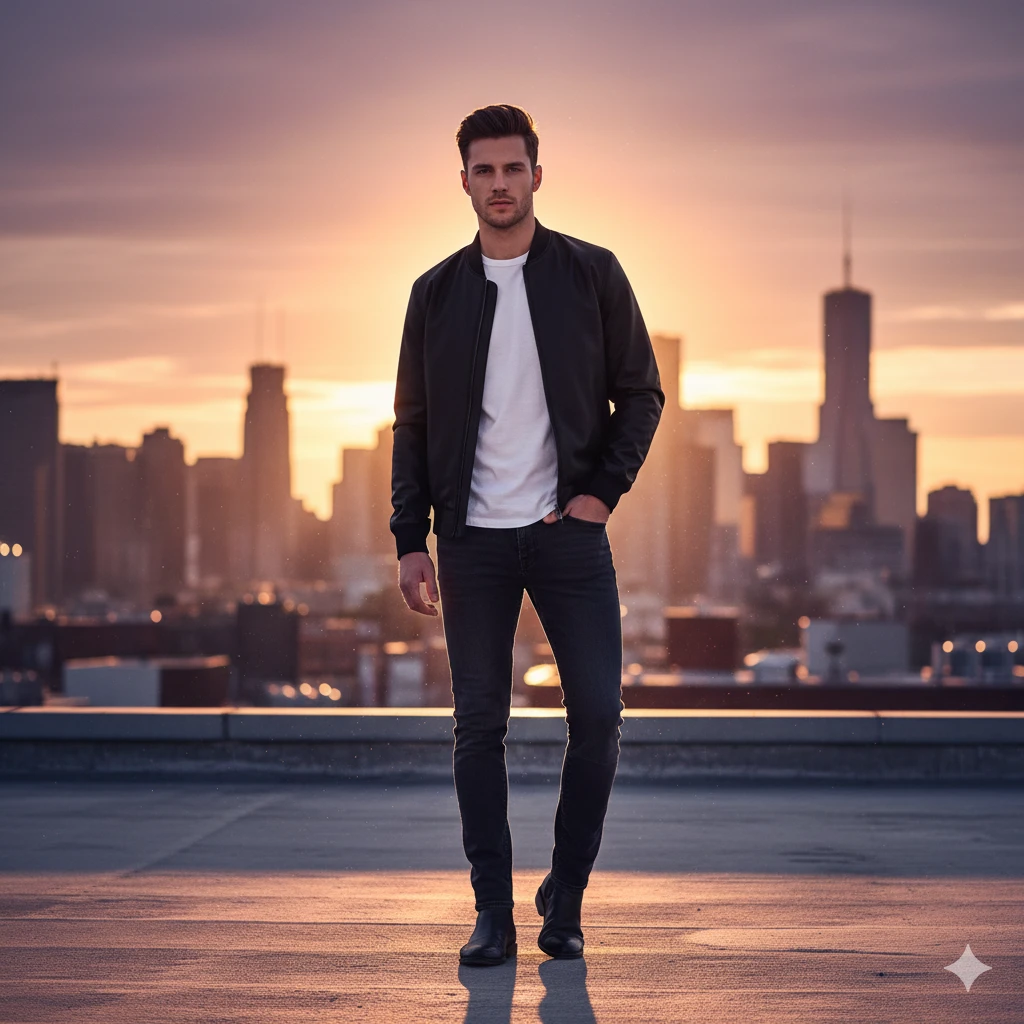 Full-body portrait of stylish man in black bomber jacket, white tee, slim jeans, standing on rooftop at sunset, city skyline background, cinematic golden hour lighting, ultra-detailed 8K fashion portrait.