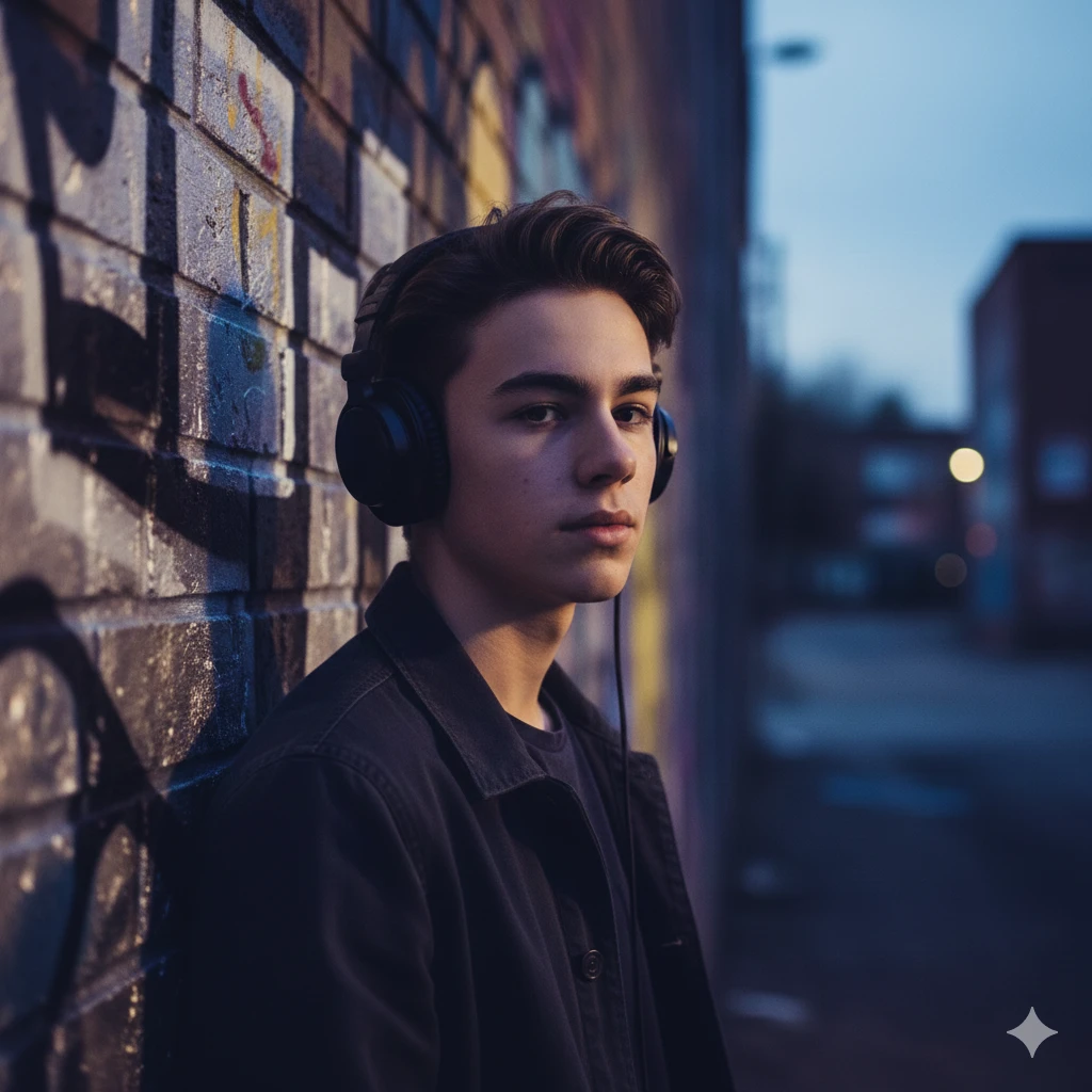 “Teen boy with headphones, graffiti wall, moody lighting, cinematic shadows, ultra-realistic 85mm portrait”