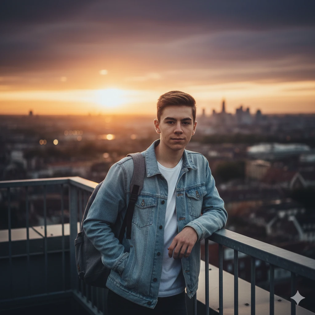 “Confident teenage boy on rooftop, city skyline background, warm sunlight, detailed facial features, cinematic lens effect”