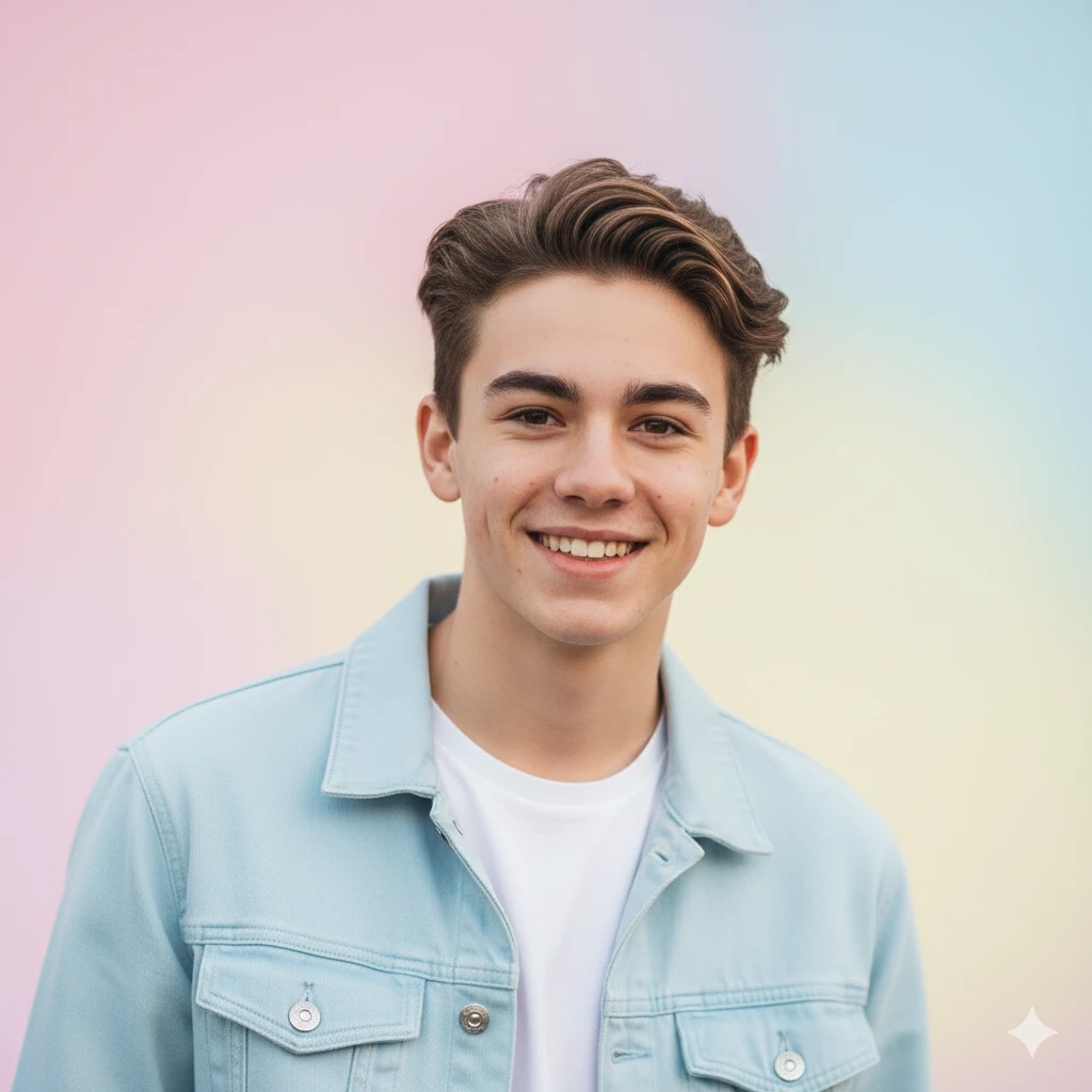 “Smiling teen boy, pastel background, soft lighting, modern hairstyle, casual jacket, Instagram-ready 4K photo”