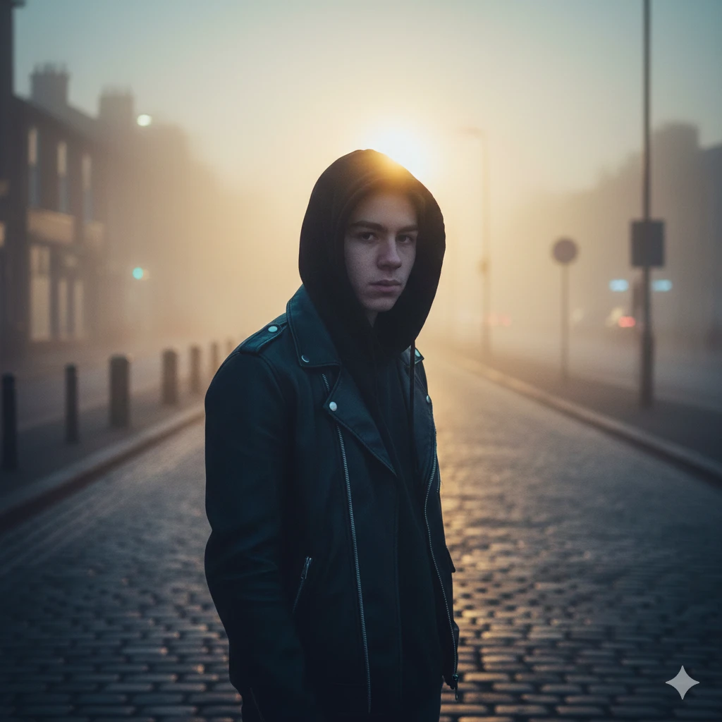“Teen boy in hoodie, foggy street morning, soft cinematic lighting, shallow depth of field, realistic AI portrait”