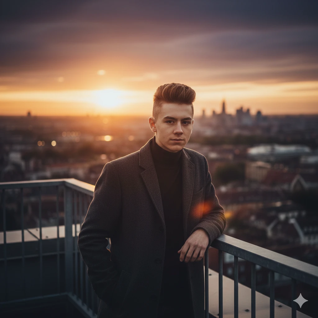 “Teen boy trendy hairstyle, city rooftop background, warm cinematic lighting, realistic Instagram-ready AI portrait”
