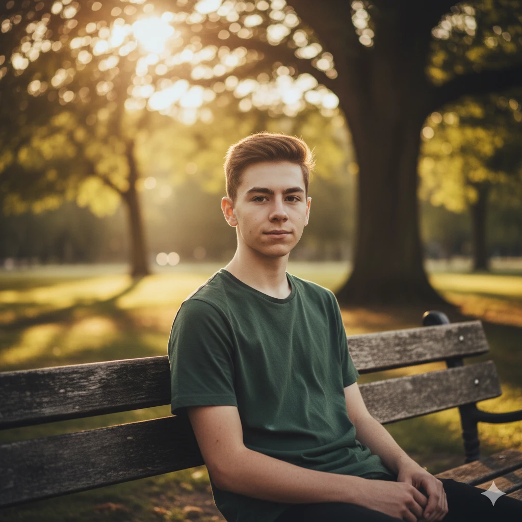 “Teen boy in casual shirt, park bench background, golden hour sunlight, cinematic color grading, 4K realistic portrait”