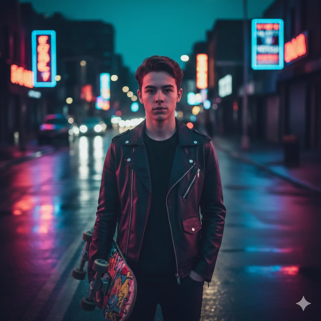 “Fashionable teen boy, urban alley background, dramatic lighting, cinematic color grading, ultra-realistic AI photo”