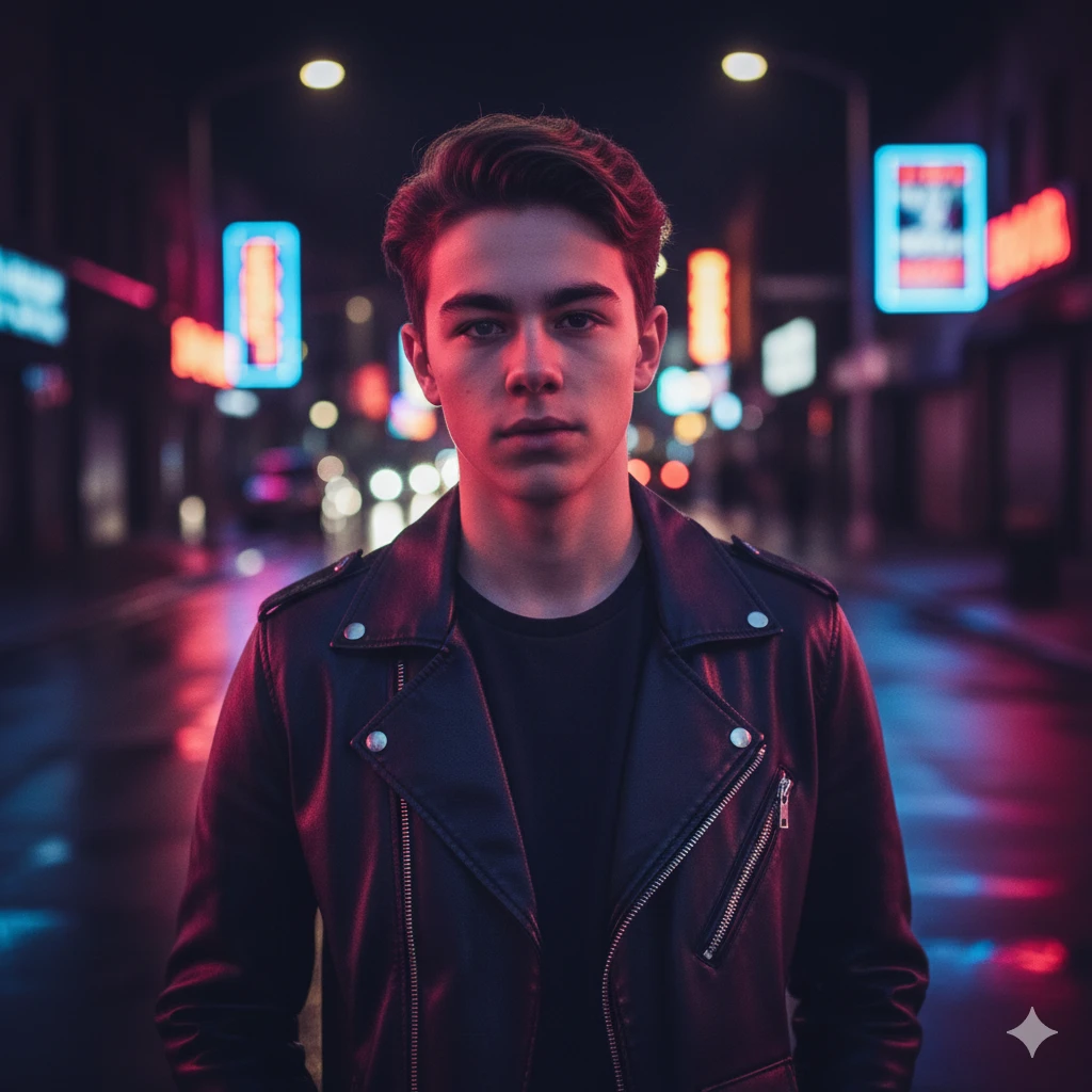 “Boy wearing leather jacket, neon lights street background, cinematic mood, highly detailed ultra-realistic portrait”
