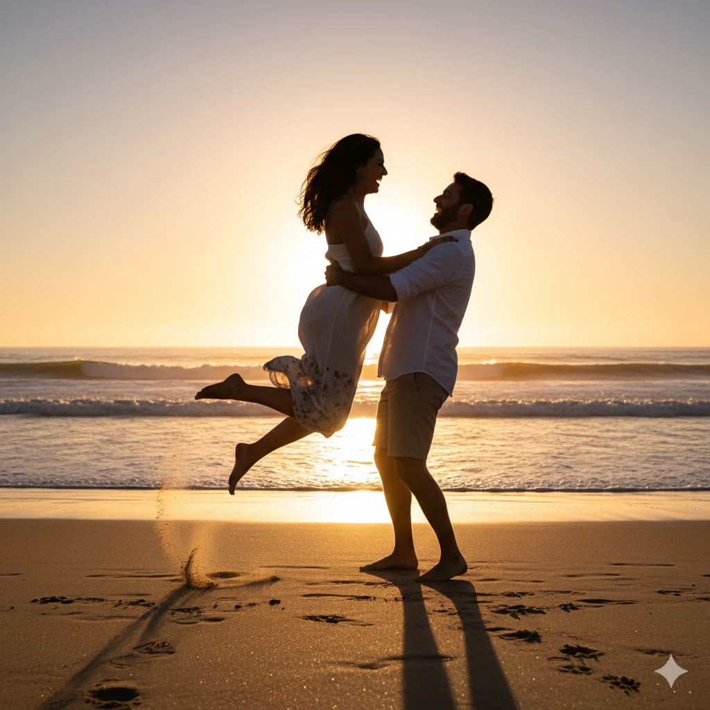 Prompt:Full body shot of a couple on a beach at sunrise, one partner running and jumping into the other's arms, both laughing with pure joy. Capture complete body extension, flowing clothes, sand kicking up, and golden light illuminating their silhouettes. Dynamic motion, 8K resolution, perfect timing.