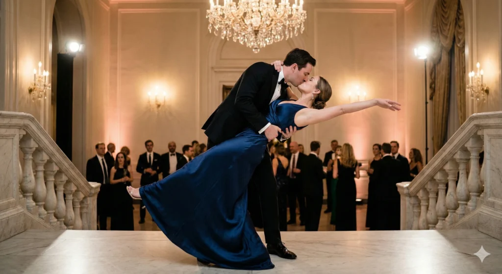 Prompt:A dramatic full body dip kiss in a classic ballroom pose. Man bending woman backward in elegant evening wear, her dress flowing gracefully, arms extended. Grand staircase background, cinematic lighting, complete body lines visible from head to toe.