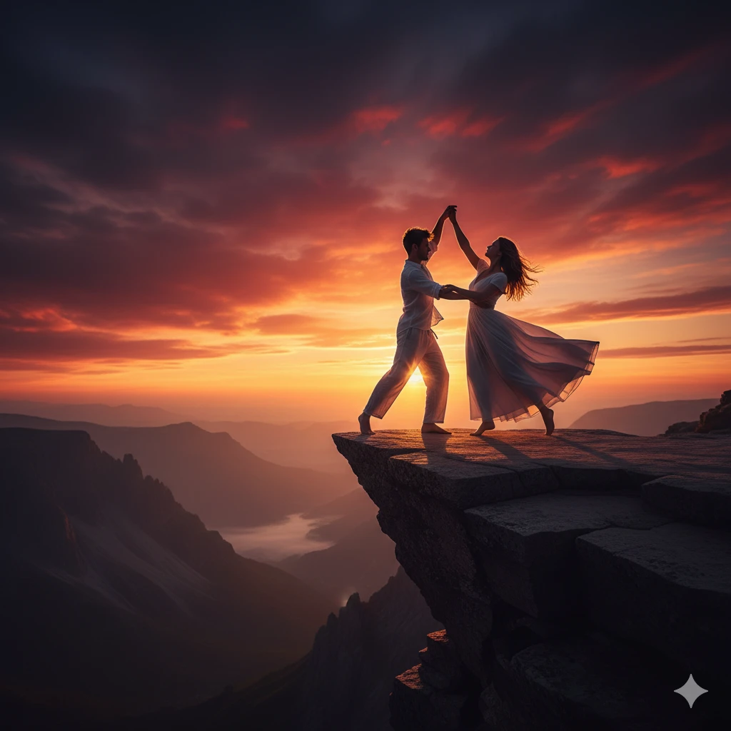 Prompt:A couple dancing on cliff edge at sunset, full body silhouettes against dramatic sky, their complete forms outlined in golden light. Flowing clothes, graceful arm positions, and emotional connection visible through body language alone.