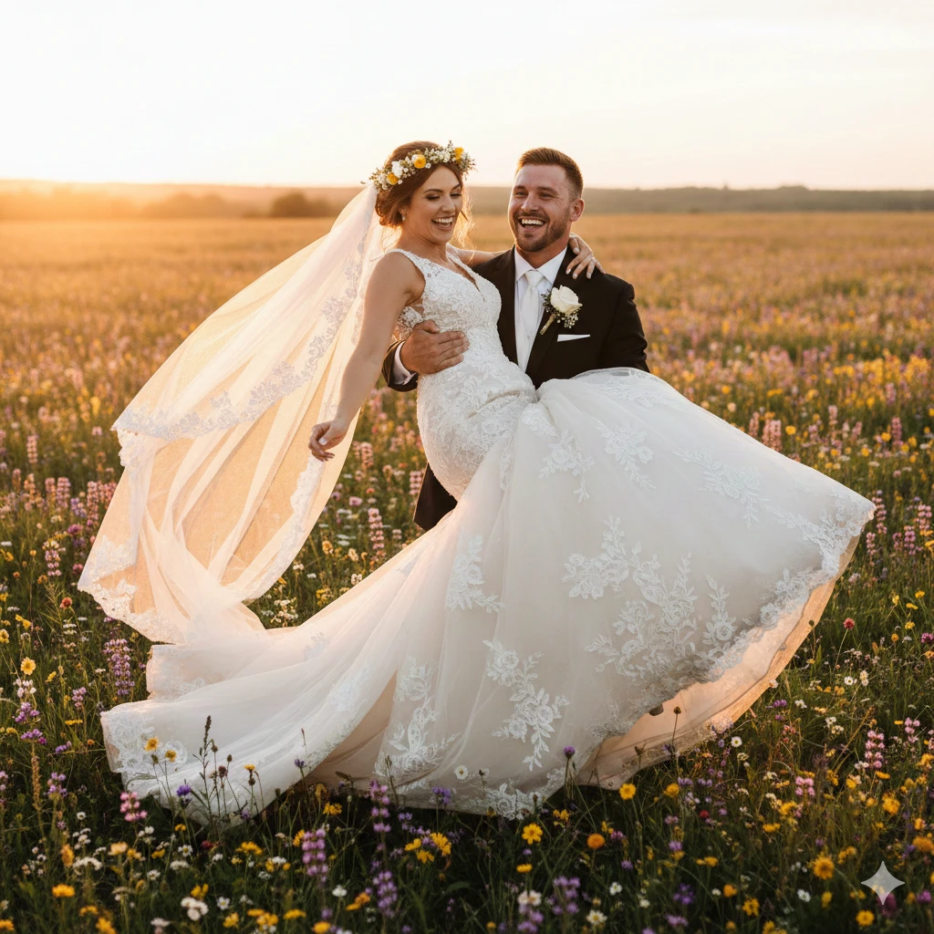 Prompt:A bride in full wedding gown being lifted and spun by groom in a flower field. Full body shot capturing the entire dress flow, veil floating, his strong lift position, and both faces radiant with happiness. Complete wedding attire details visible.