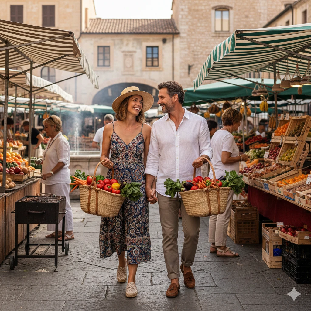 Prompt:A couple shopping at colorful outdoor market, holding baskets of fresh produce, both in casual chic outfits. Full body shot showing complete casual wear, market surroundings, and shared domestic happiness. Natural lighting, authentic moments.