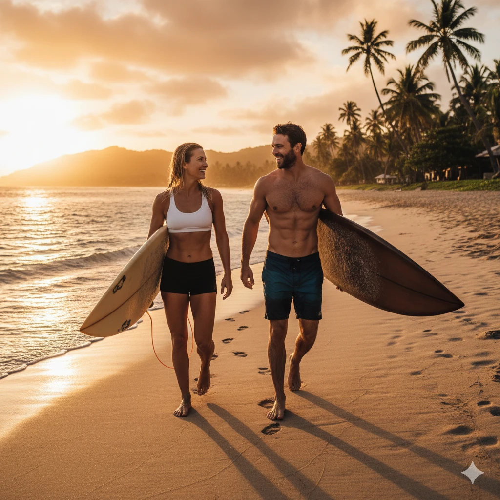 Prompt:A athletic couple carrying surfboards walking from ocean to beach at sunset, wet hair, beachwear showing toned bodies, saltwater glistening on skin. Full body athletic composition, tropical background, healthy lifestyle romance.