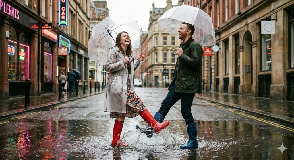 Prompt:A couple in stylish rainwear dancing joyfully through urban puddles after rain. Full body composition showing colorful rain boots splashing water, transparent umbrellas, reflections on wet pavement, and genuine laughter. Urban fashion meets romantic spontaneity.