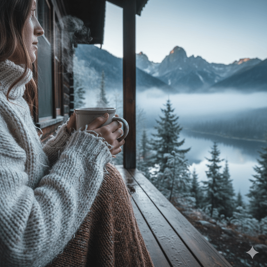 Prompt:A couple in cozy sweaters sitting on a cabin porch overlooking misty mountains, holding steaming mugs, detailed wool texture, realistic mountain landscape, cold breath visible in air, intimate morning moment, ultra-high definition