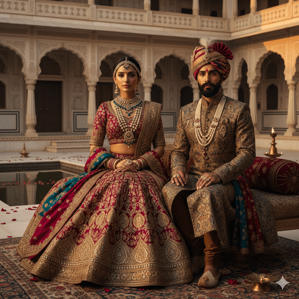 Prompt:An Indian royal couple in elaborate antique jewelry and silk outfits, sitting in a palace courtyard with marble architecture, golden hour lighting, intricate fabric details visible, regal pose, ultra-realistic skin tones and textures
