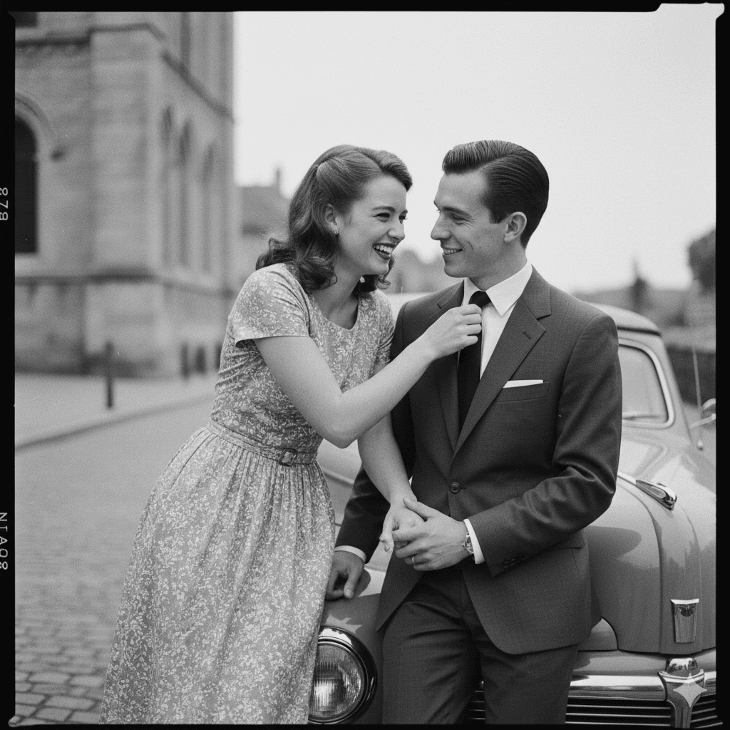 Prompt:An ultra-realistic couple portrait from 1950s style photoshoot, black and white, a young couple sitting on a vintage car, she's laughing while fixing his tie, grainy film texture, 8K resolution, photorealistic skin details, timeless romance