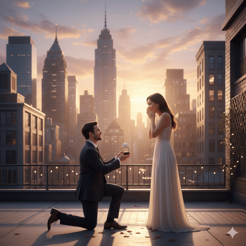 Prompt:A man proposing on knee on urban rooftop at sunset, city skyline behind them, she has hands over mouth in surprise, detailed ring visible, golden hour lighting, realistic building textures, emotional facial expressions