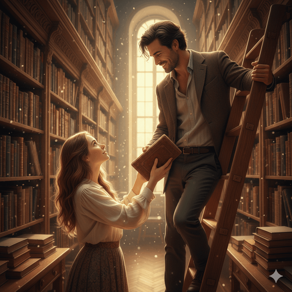 Prompt:A man on library ladder handing a book to woman looking up, thousands of books in background, dust particles in sunbeams, realistic book textures, intellectual romance, soft natural lighting, ultra-detailed skin and fabric