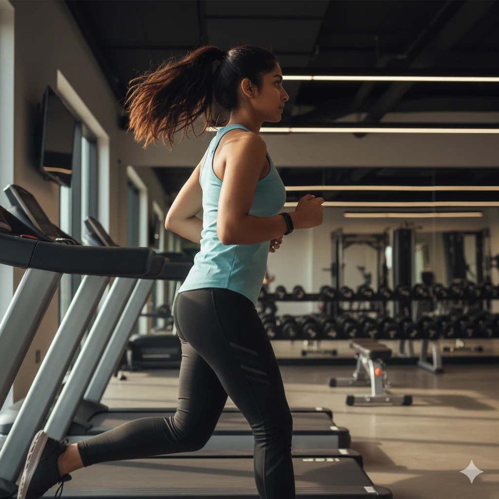 Create a realistic cardio workout scene of an Indian girl running on a treadmill. She wears breathable gym clothing with minimal accessories. Motion blur on her legs adds realism, while her facial expression shows determination. Balanced indoor lighting and modern gym interiors complete the scene.
