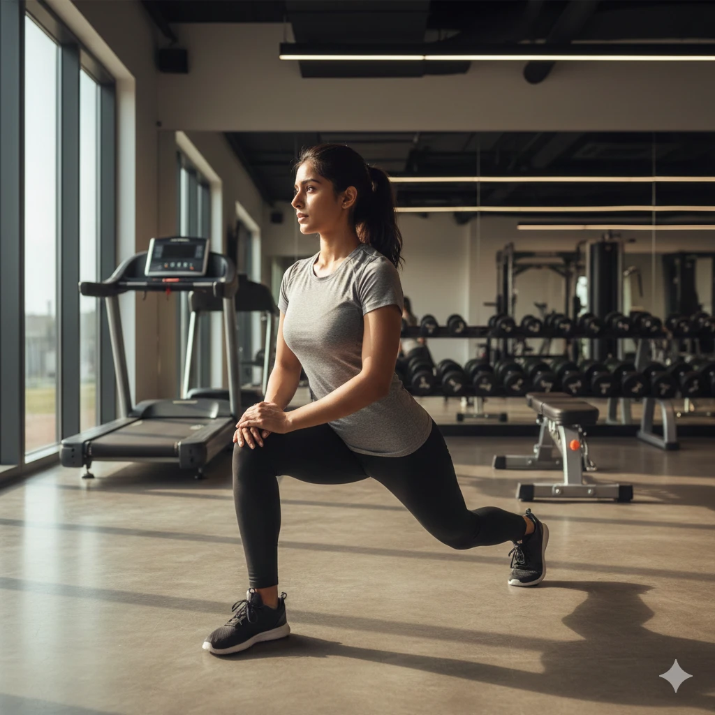 Create a realistic photo of an Indian girl doing warm-up stretches inside a modern gym during early morning hours. She is wearing a fitted gym t-shirt and leggings, hair tied in a ponytail. Soft natural light enters through large windows, highlighting toned muscles and natural skin texture. Clean gym equipment and mirrors appear in the background, creating a calm yet focused fitness atmosphere.
