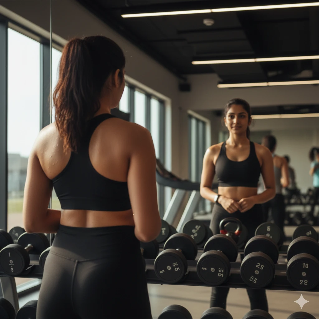 Generate a realistic mirror-shot image of an Indian girl standing confidently after a workout. She looks at her reflection with a slight smile, sweat visible on her skin. Gym mirrors, weights, and soft overhead lighting add authenticity and emotional depth to the fitness environment.