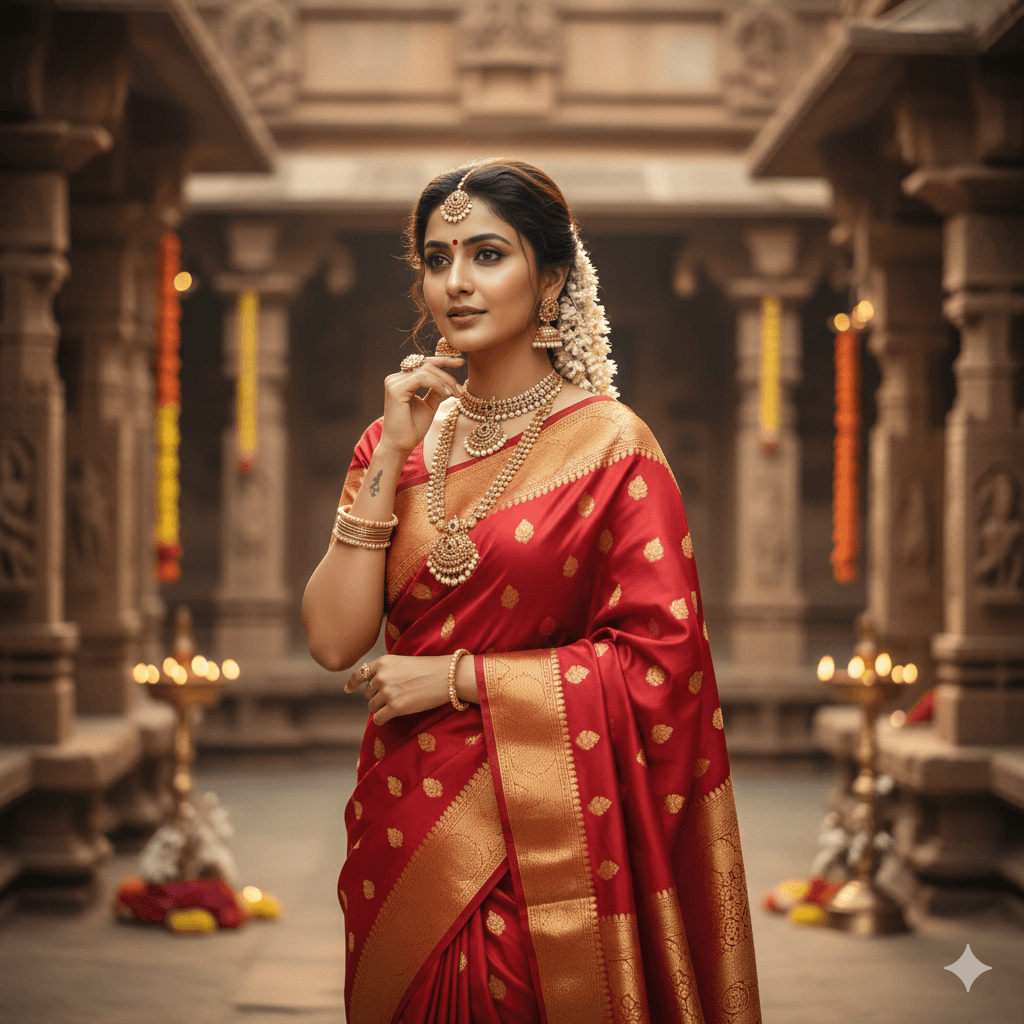Prompt: Indian girl wearing a classic red saree with golden border, temple jewelry, soft warm lighting, elegant traditional pose, ultra-realistic 4K portrait.
