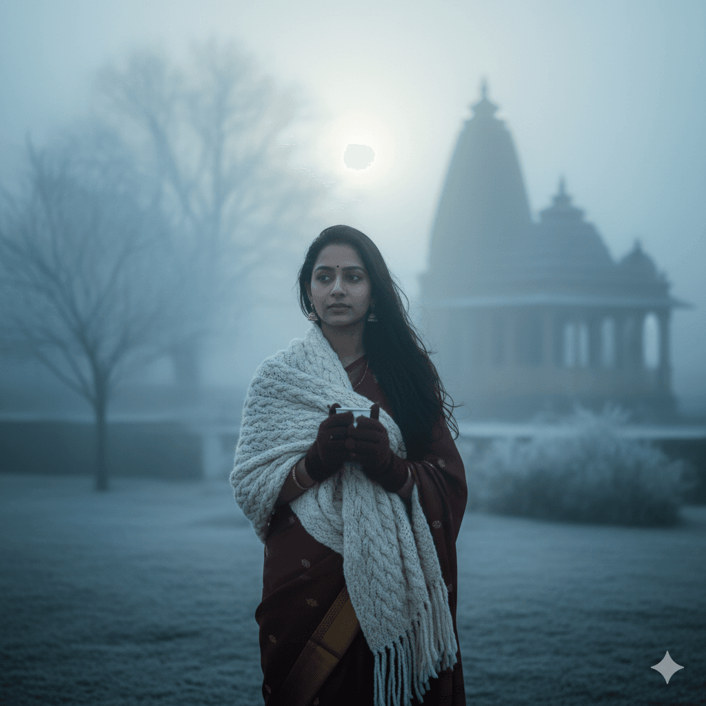 Prompt: Indian girl wearing woolen shawl over saree, winter morning fog, soft cool tones, cinematic winter portrait.