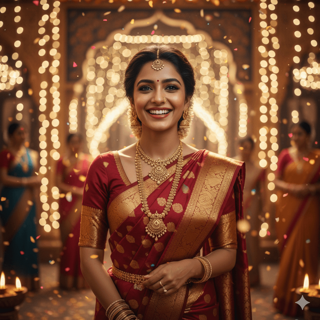 Prompt: Indian girl in rich silk saree, festive lights behind, soft bokeh, warm tones, joyful expression, 4K festive portrait.