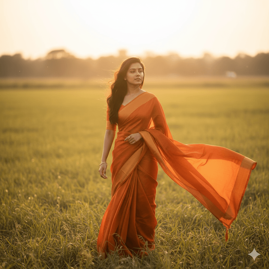 Prompt: Indian girl in orange saree, golden-hour sunlight, soft wind effect, dreamy background, cinematic 4K.